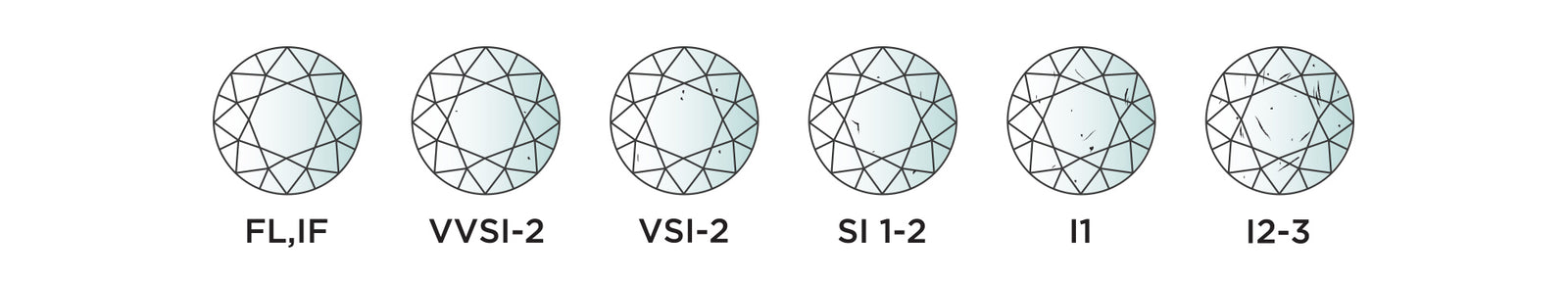 This relates to the marks of non-crystallised carbon called ‘inclusions’ found within the diamond. The inclusions vary in standards on the spectrum ranging from FL (flawless), SI1 () to I3. It is exceedingly rare for a diamond to be flawless, known as FL and is the highest level on the spectrum. SI1 is in the middle of the spectrum and it is recommended when buying a diamond, you should not purchase lower than this standard. I3 is the lowest as it includes the mot inclusions and is least clear.