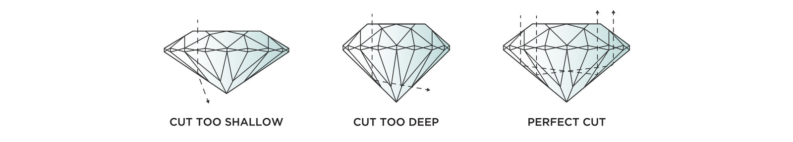 The cut of a stone is not relating to the shape, but refers to the way the cutter has formed it to best ensure that light bounces within the stone and back out through the top. If it has a defective cut (too long or too short) the light refracts on the inside and falls out down the bottom. This decreases the brightness and lustre of the stone. A well cut stone is neither exceedingly long nor shallow, it is luminous and will always dazzle even when dirty.The grading system varies from Ideal Cut to Good and lastly, Poor Cut. With round diamonds, it is suggested to never purchase below ‘Very Good’ and ‘Good’ in all other shapes. Again, the better cut stone the more it will cost.